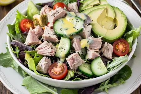 Вкусный салат с тунцом, свежим огурцом, яйцами и листьями салата. Заправка из оливкового масла, лимонного сока, соли и перца — свежесть и польза.