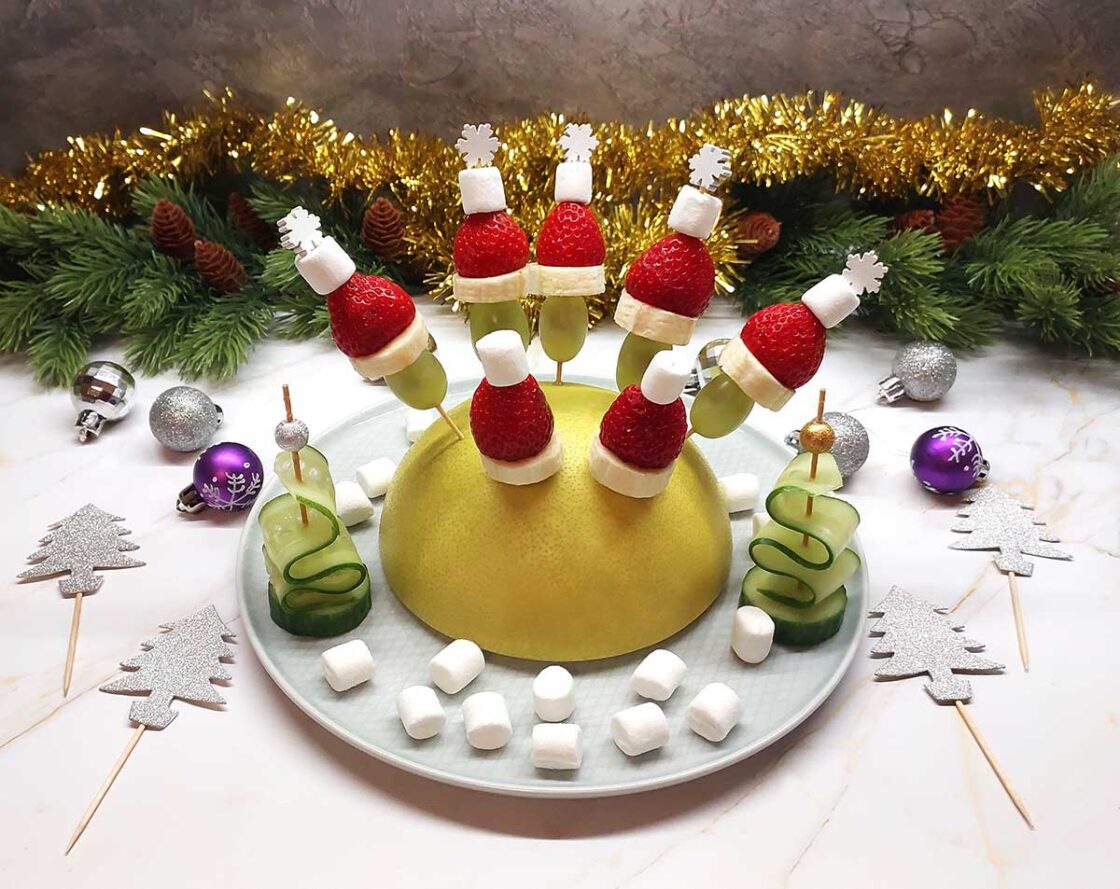 Вообще говоря, сама концепция сладких канапе, представляющих собой кусочки фруктов и ягод, нанизанных на зубочистки или шпажки, является довольно очевидной и весьма перспективной, поэтому ничто не мешает использовать для приготовления подобного десерта любые компоненты, которые вам понравятся. Но в данном случае нашей целью будет не просто приготовить вкусный и полезный фруктовый десерт для праздника, но и сделать его настолько привлекательным, чтобы он не затерялся на столе среди других угощений, а сразу же завоевал всеобщее внимание и симпатию. По этой причине я предлагаю взять бананы и свежую клубнику, крупный белый виноград и миниатюрные зефирки маршмэллоу, а затем расположить эти компоненты на шпажках в определенной последовательности, в результате чего у нас получится целая армия дедов Морозов, которая порадует и детвору, и остальных участников застолья независимо от возраста и вкусовых предпочтений. Это фруктовое канапе очень увлекательно готовить вместе с домочадцами, а за столом оно создает атмосферу веселья и непринужденности, и не вызывает никаких сомнений, что это лакомство скорее всего окажется самым полезным блюдом в праздничном меню и при этом одним из самых вкусных. С наступающим Новым годом!