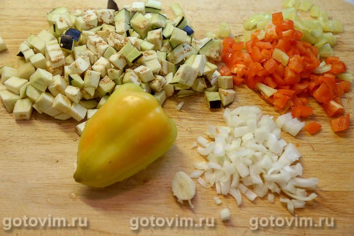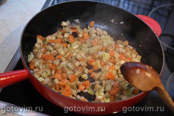 В сковороде разогреть 2-3 ст.л. растительного масла, добавить овощную нарезку — все овощи и чеснок сразу. Пассеровать на небольшом огне, помешивая лопаткой, пока овощи не станут мягкими. Слегка посолить, поперчить.