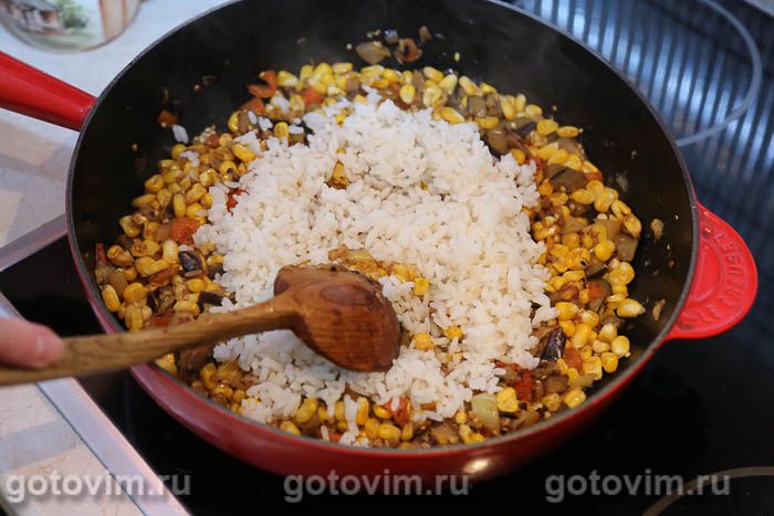 Теперь остается добавить вареный рис и перемешать. Подержите гарнир еще немного на плите, чтобы он прогрелся. Гарнир из кукурузы с рисом готов. Остается разложить его по тарелкам и подать на стол. Приятного аппетита!