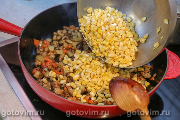 К овощной пассеровке добавить кукурузные зерна, посолить по вкусу, размешать, влить примерно 1 стакан воды и тушить под крышкой на небольшом огне примерно 20 минут, пока кукуруза не сварится, а вода не испарится.