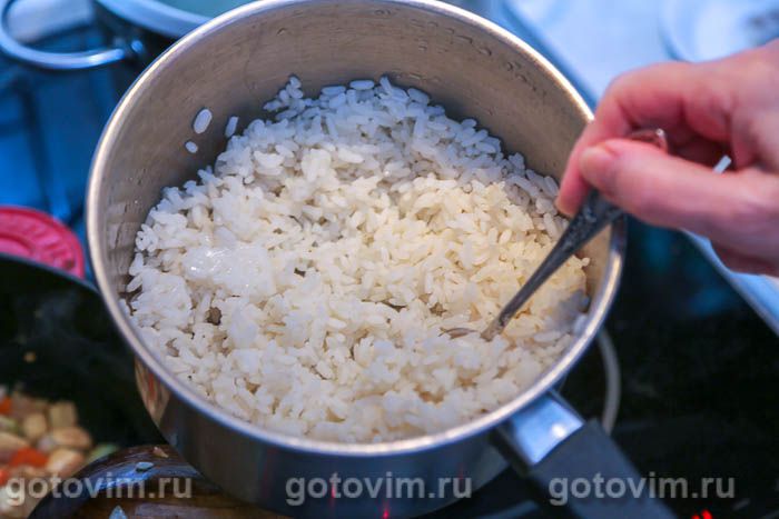 Стакан риса (круглый краснодарский или длиннозерный), несколько раз промыть в холодной воде, откинуть на сито, чтобы вода стекла по максимуму. Пересыпать рис в кастрюлю, добавить соль, залить водой так, чтобы она была на 1.5-2 см выше уровня риса. Закрыть кастрюлю крышкой и поставить на сильный огонь. Как только вода закипит, не открывая крышки, уменьшить нагрев до минимального и варить в течение 20 минут