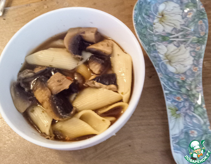 Соедините грибной суп с макаронными изделиями. Разложите по блюдам. Можно подавать. Приятного аппетита.