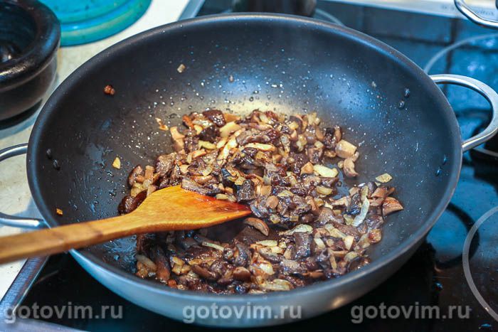 В глубокой сковороде или казане (у меня вок) пассеровать на растительном масле репчатый лук вместе с чесноком и добавить грибы. Посолить и обжаривать, помешивая, все вместе до образования корочки. Переложить грибы на тарелку.