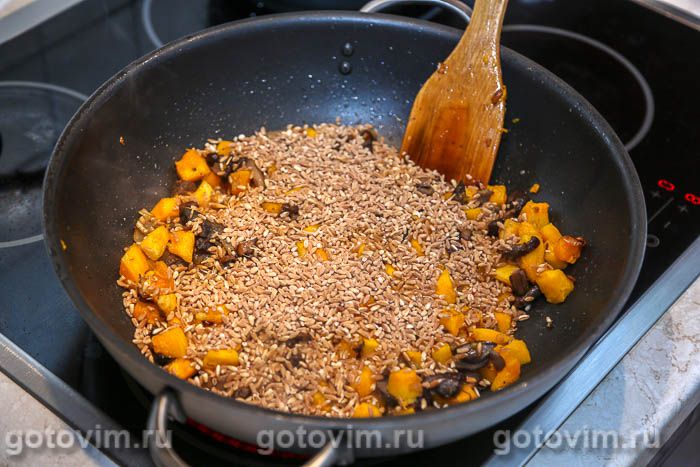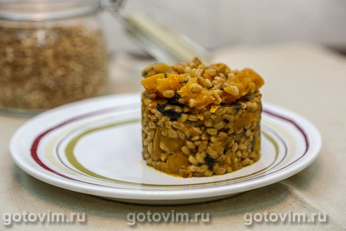 Вернуть в сковороду с тыквой грибы и добавить полбу, равномерно распределив её по слою грибов с тыквой. Влить грибной бульон или воду, чтобы уровень воды был примерно на 1 см выше уровня продуктов в сковороде. Довести воду до кипения, после чего уменьшить огонь и варить кашу из полбы под крышкой 20-25 минут. Не думайте, что полба варится так же долго, как перловка, потому что внешне на неё похожа. Нет, полба варится быстрее. Как только вода полностью испарится, проверьте готовность крупы. Если зернышки полбы мягкие, то можно снять сковороду с плиты и перемешать кашу. Если нет — то влить немного воды из чайника, и продолжать варить до готовности крупы. Готовую кашу из полбы с грибами и тыквой выложить на тарелку и подавать к столу. При желании, можно посыпать её на манер ризотто, не побоюсь предложить, тертым пармезаном или другим зрелым твердым сыром. От этого каша только выиграет. Приятного аппетита!