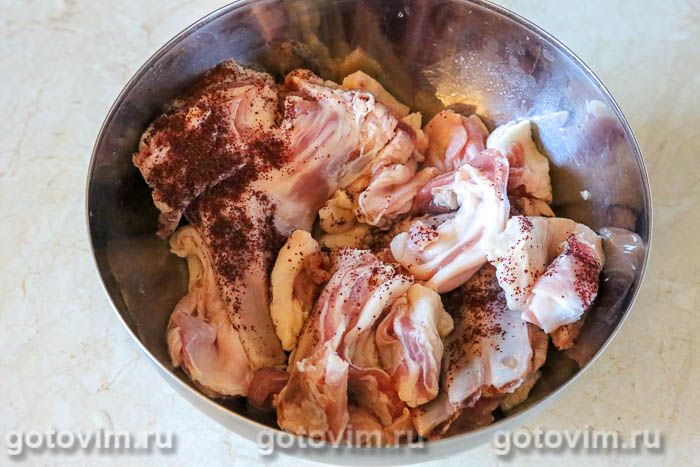 Мясо сложить в миску, посыпать солью и специями, можно капнуть немного растительного масла, чтобы специи лучше раскрылись. Перемешать мясо в миске и убрать в сторону, пока будете готовить овощи.