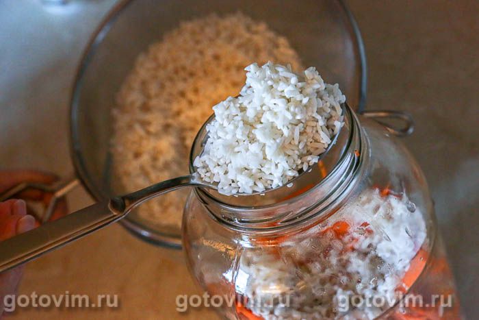 Поверх мяса с овощами насыпать рис. Немного присолить. Банка должна быть наполнена не более чем на 2/3 своего объема. Налить питьевой воды, чтобы она почти доходила до уровня риса. Помним, что мясо с овощами еще даст сок, и жидкости в банке станет больше.