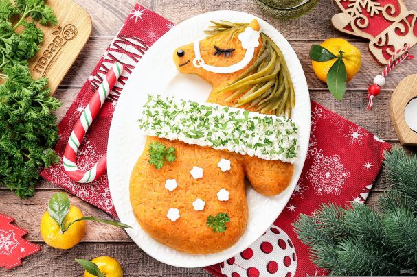 Выложите салат на плоскую тарелку и придайте ему форму варежки с выглядывающей из неё головой лошади.