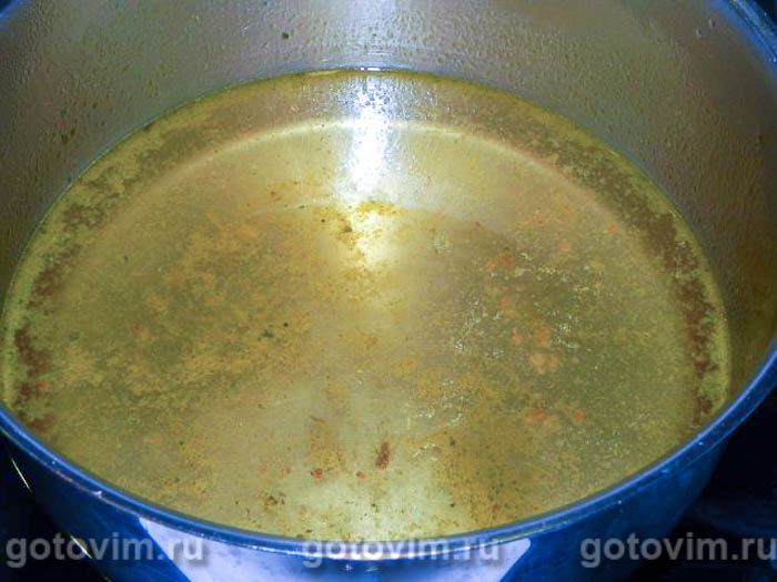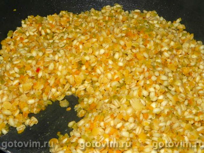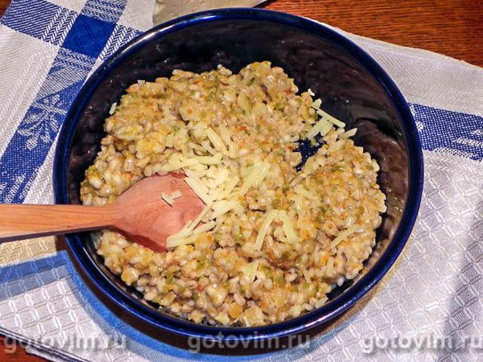 Затем влить половину бульона и перейти на медленный огонь. Варить под крышкой, периодически помешивая. Когда весь бульон впитается, то подливать еще бульона, понемногу. Варить таким образом до готовности крупы, примерно 20-25 минут.