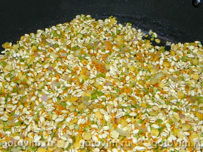 Добавить зерновую смесь, увеличить огонь и обжарить несколько минут.