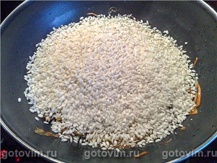 Присолила, перемешала и всыпала рис. Дала пару минут рису прогреться, и залила горячим бульоном.