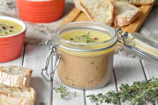 Оставшееся сливочное масло растопите вместе с щепоткой тимьяна и горошинами перца. Залейте паштет сверху слоем растопленного масла.