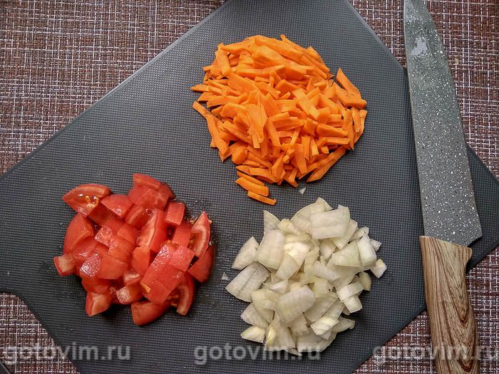 Для плова в мультиварке сначала подготовить овощи. Вымыть, очистить морковь и репчатый лук. Лук и морковь некрупно нарубить. Помидор желательно ошкурить, как описано в этом рецепте.