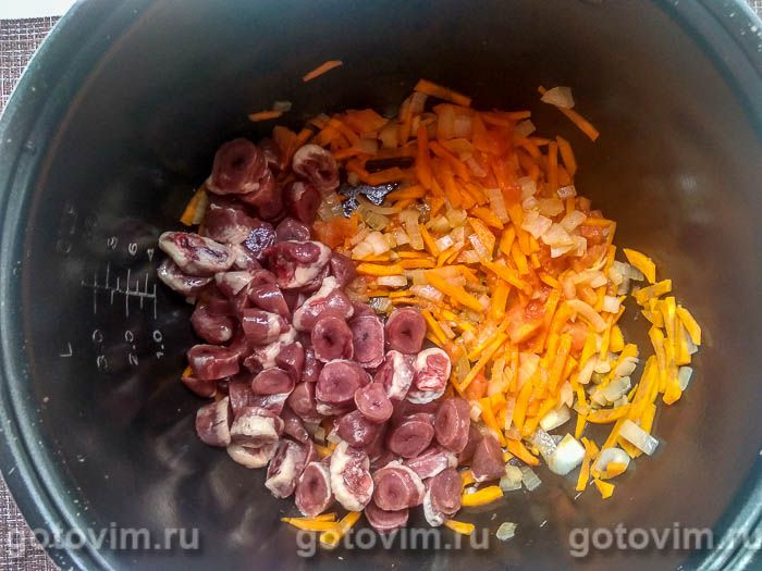 Сердечки добавить в мультиварку и обжаривают вместе с овощами около 7 минут.