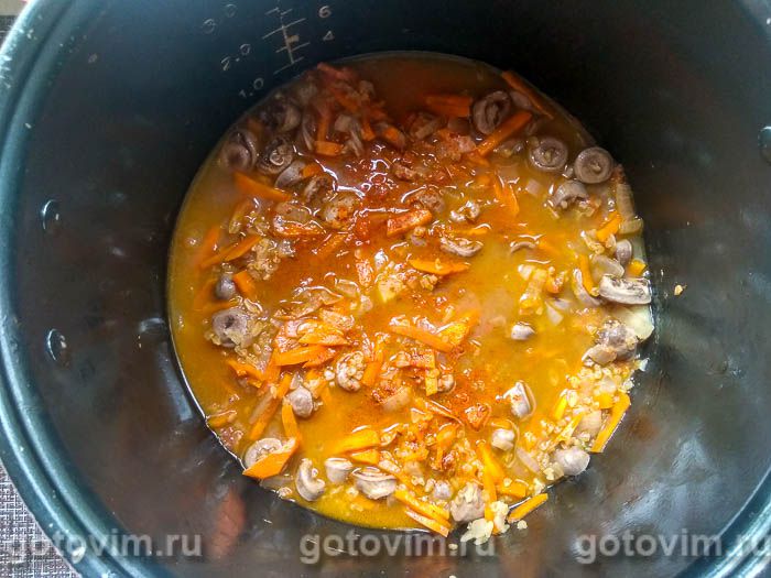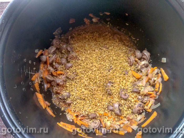 Добавить специи и питьевую воду (2-2.5 стакана). Мультиварку установить в режим «Плов» на 55-60 минут. Плов из булгура с куриными сердечками в мультиварке всегда получается невероятно рассыпчатым, с насыщенным вкусом и ароматом.