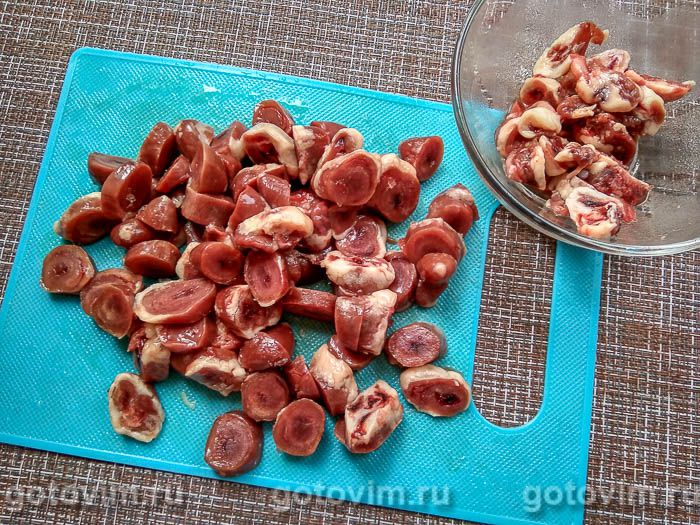 Тем временем промытые куриные сердечки промыть, срезать с них жир и сосуды и по желанию разрезать пополам.