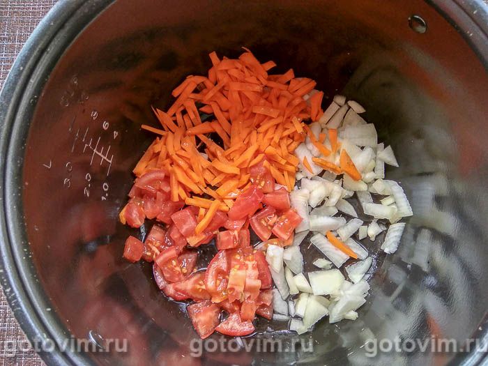 Переложить нарезанные овощи в чашу мультиварки и обжаривают на масле до мягкости при открытой крышке.