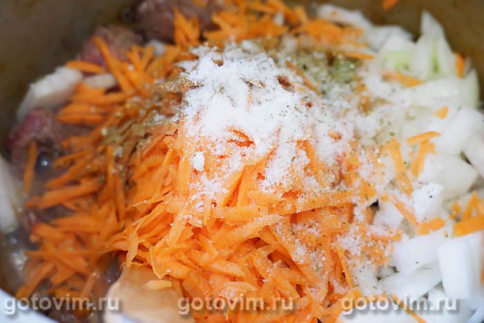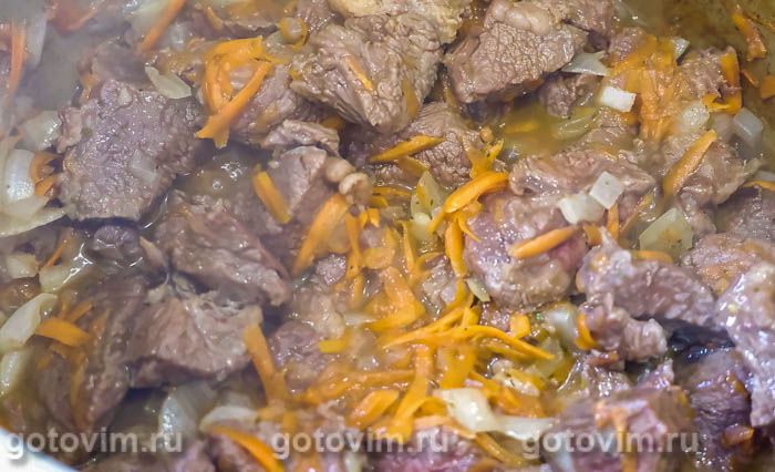 Пока обжаривается мясо, почистить лук и морковь. Лук нарезать полукольцами, морковь — соломкой или натереть на крупной терке.