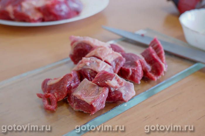 Когда рис будет подготовлен, можно заниматься мясом и овощами. Мякоть говядины обсушить на бумажных полотенцах, срезать все пленки, затем нарезать небольшими кубиками примерно 3х3 см.