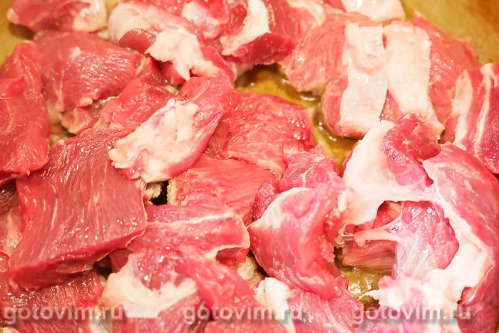 В мультиварке на режиме «Жарка» разогреть 2-3 ст.л. растительного масла и переложить нарезанное мясо. Жарить на масле, периодически помешивая, пока говядина не подрумянится.