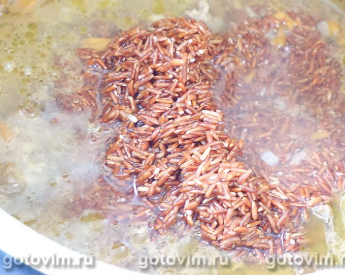 Теперь самое время засыпать подготовленный красный рис. Разровнять его ложкой и влить холодную питьевую воду. Вода должна полностью покрывать все ингредиенты. Включить в мультиварке режим «Плов» и готовить в течение 1 часа, проверяя изредка, не подгорает ли рис.