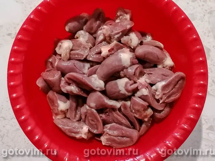 Куриные сердечки разрезать пополам, срезать лишний жир и промыть от сгустков крови.