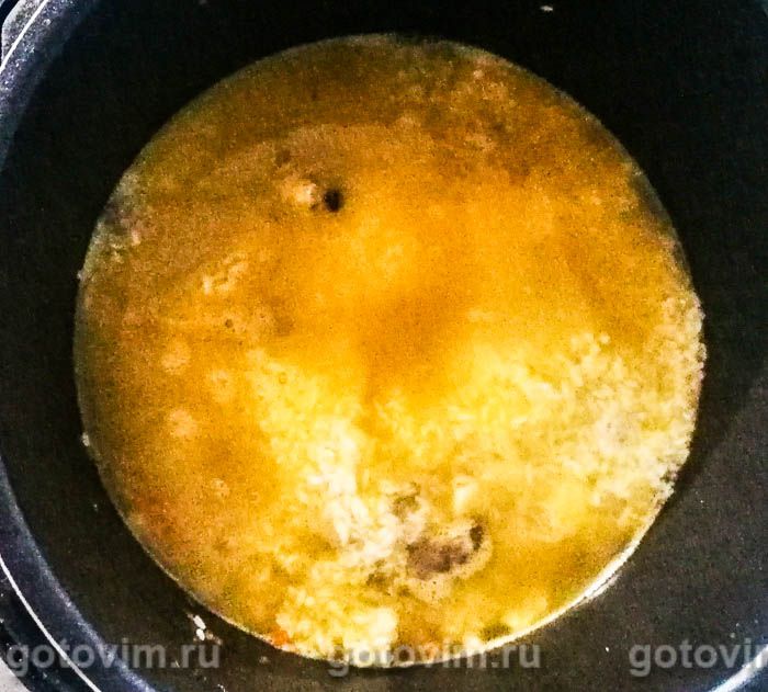 Подготовленный рис распределить по мясу. Воткнуть в рис зубчики чеснока. Если нужно, еще раз досолить и залить водой. Уровень воды должен быть на 1 см выше уровня риса. Поставить мультиварку на режим «рис» или «плов» на 20 минут.