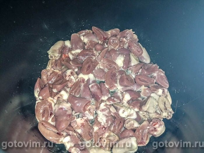 Мультиварку включить на режим «жарка», добавить в чашу немного растительного масла и обжаривать сердечки минут 7-10, пока не начнет выделяться жидкость.