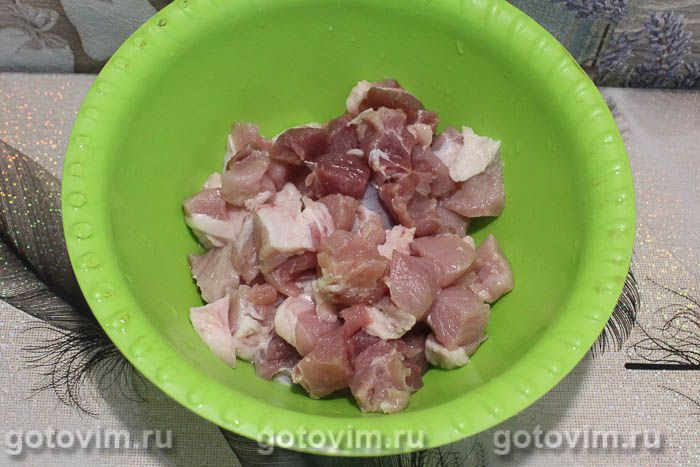 Сначала сделать заготовки: нарезать мясо крупными кусочками, лук — тонкими полукольцами.
