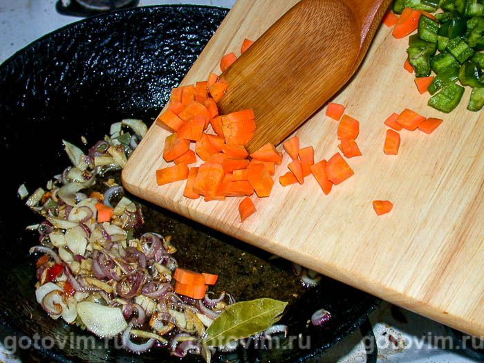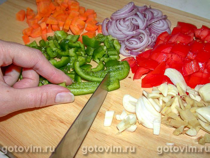 Рис промыть и замочить в холодной воде примерно на час. Затем откинуть на сито и дать воде стечь. Сладкий перец, томаты и морковь очистить, нарезать кубиками. Лук порезать довольно мелко, чеснок и имбирь тонко порубить.