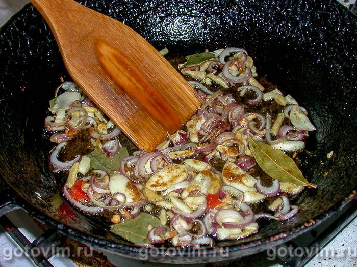 В сковороде с толстым дном (можно в воке или казане) прогреть около 4 ст.л. масла, добавить лук и прожарить до прозрачности. Затем прибавить к луку чеснок, имбирь, смолотые бутоны гвоздики, лавровый лист, перемешайте и прогрейте около минуты, постоянно помешивая. Следите, чтобы пряности не горели. Посыпьте сверху порошок карри и перемешайте.