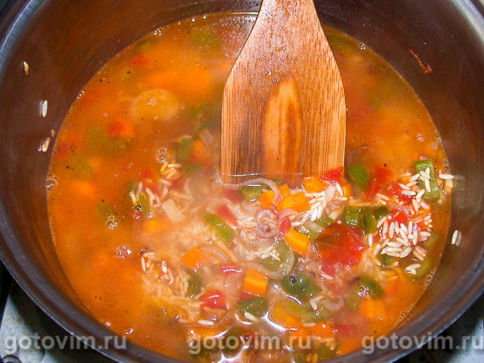 Добавить рис, посолить и перемешать. Влить оставшийся бульон и оставить на максимальном нагреве до кипения, после чего огонь уменьшить, накрыть посуду крышкой и оставить готовиться еще примерно на 10 минут. После проверьте готовность риса — он должен быть слегка жестким внутри.