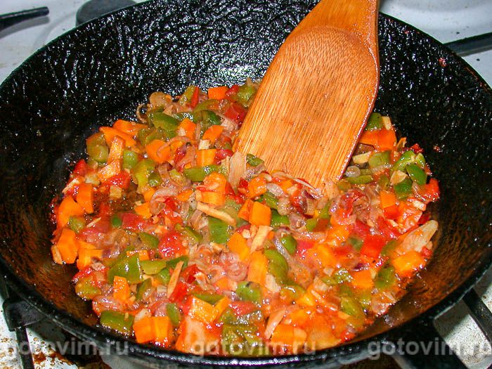Добавить в сковороду перец, томаты и морковь, перемешать и влить стакан бульона.