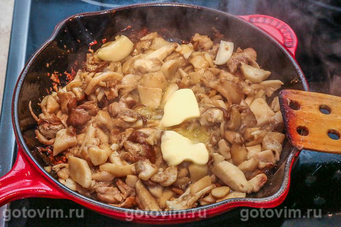 Добавить очищенный, разрезанный пополам чеснок, перемешать приправить солью, перцем. Добавить небольшой кусочексливочного масла. и убрать сковороду в предварительно прогретую до 200С духовку примерно на 10 минут.