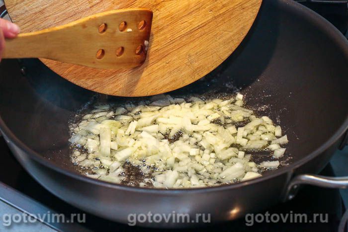 В глубокую сковороду влить оливковое масло, добавить небольшой кусочек сливочного масла (примерно 15г), разогреть и добавить мелко нарезанный лук. Прибавить к луку измельченный зубчик чеснока и готовить до прозрачности лука.