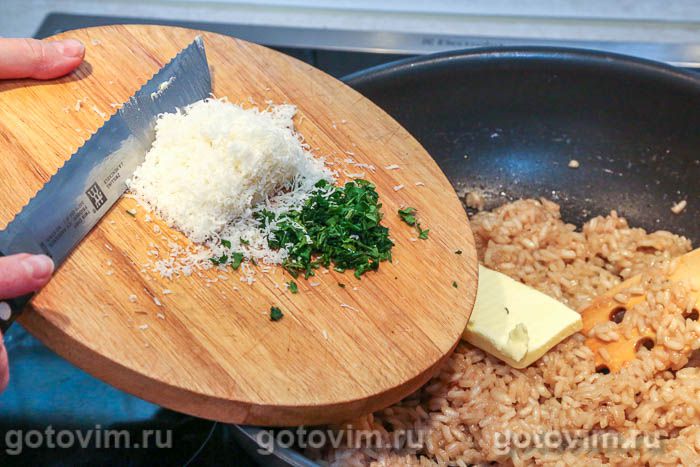 Снимите готовый рис с огня. Добавьте оставшееся сливочное масло, тертый пармезан и мелко нарезанную петрушку. Хорошо перемешайте, накройте крышкой и отставьте в сторону.