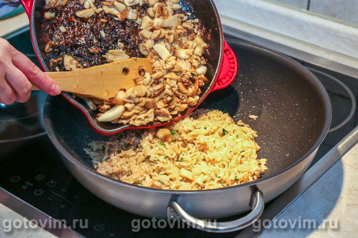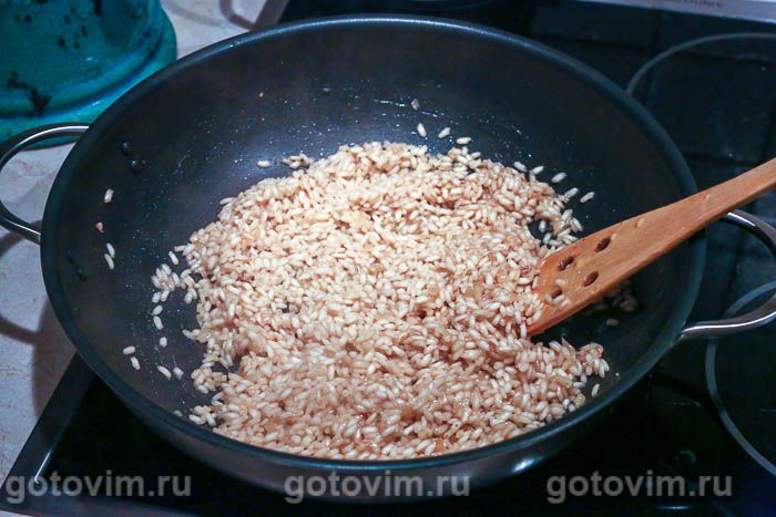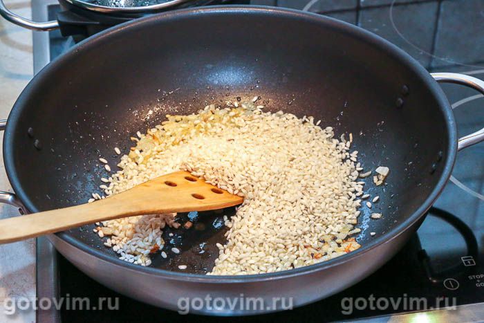 Засыпать в сковороду рис, увеличить огонь до максимума и, постоянно помешивая, готовить до тех пор, пока рисинки станут прозрачными. Влить вино, готовить, помешивая, пока вино наполовину выпарится. В готовом блюде вино придаст приятную кислинку рису.