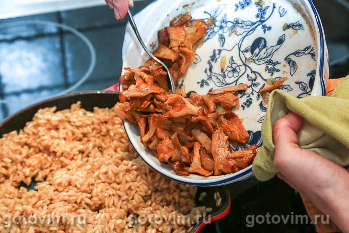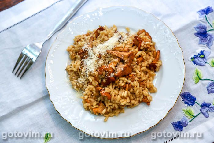Ризотто с лисичками понравится всем, кто любит грибы. Потому что в этом блюде их много. Ризотто готовится как обычно, и лисички, запеченные в духовке, добавляют в уже готовый рис.