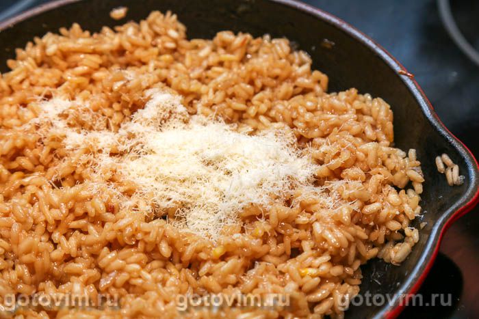 Продолжайте добавлять бульон, пока рис не станет мягким. Если бульон закончится, можно подлить кипяток. Приправить рис по вкусу солью и свежемолотым черным перцем, снять с огня, добавить оставшееся сливочное масло, тертый пармезан (или другой твердый сыр). Хорошо перемешайте.