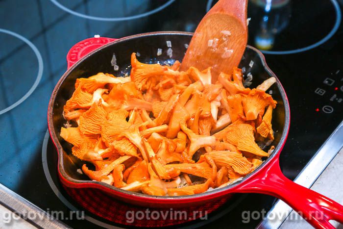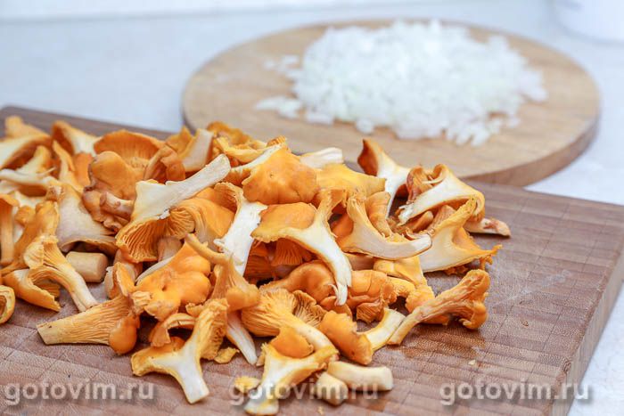 Лисички перебрать, промыть, откинуть на дуршлаг, а затем обсушить на кухонном полотенце. Крупные лисички разрезать
