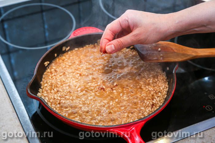 Влить в сковороду половник горячего бульона (или воды), приправьте 1 ч.л. соли и готовить рис, раз за разом по половнику добавляя бульон, не забывая помешивать рис. Каждый последующий половник бульона вливайте только тогда, когда предыдущий уже впитается.