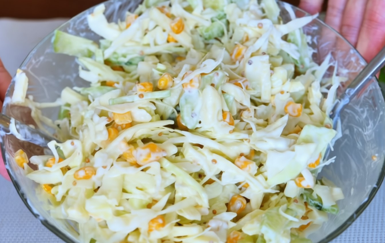 В салате “Незабудка” капуста играет главную роль. Она придает сладость и хруст блюду. Дополняется капуста кисло-сладким яблоком, кукурузой и огурцом.