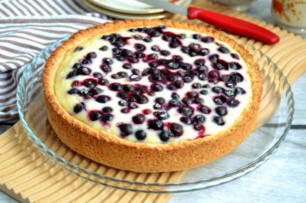 Выложите смородину поверх сметанной начинки. Разогрейте духовку до 180 градусов, выпекайте сметанник до готовности примерно 40 минут. Начинка в горячем сметаннике сначала может слегка подрагивать, но потом она стабилизируется.