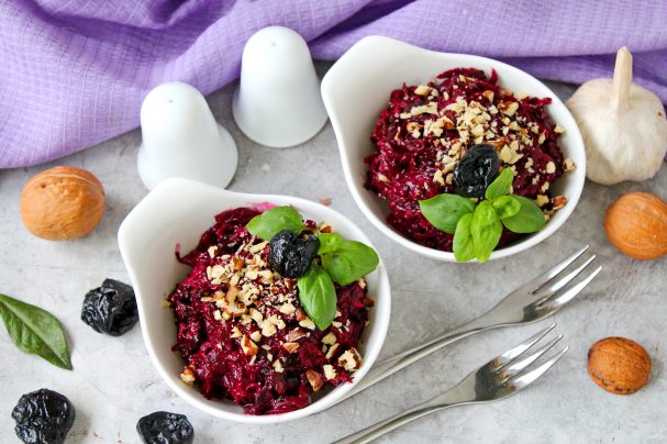 Свекла с черносливом готова. Разложите салат порционно, посыпьте рублеными орехами и подавайте на стол.