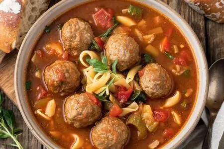Рецепт классического супа с тефтелями из мясного фарша (свинина, говядина), лука, моркови, картофеля, риса, яйца, лаврового листа, соли, перца и масла для обжарки овощей.