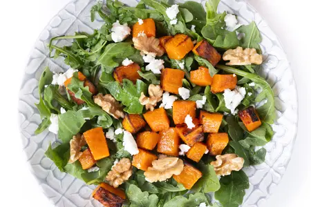 Рецепты тёплых салатов с тыквой, оливковым маслом, козьим сыром, орехами, клюквой и мягким балансом соли и перца. Свежие листья салата и сладкие нотки меда или кленового сиропа.