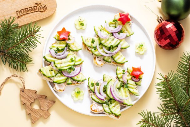 Ниже я расскажу подробнее, как приготовить тосты "Елочки". Вместо творожного сыра можно взять какой-нибудь паштет, соус песто или плавленый сыр. Хлеб я использовала тостовый, но подойдет также и черный ржаной, если любите. Очень вкусное сочетание хрустящего белого хлеба с творожным сыром и свежим огурцом, а оригинальная подача тостов в виде елочек сразу создает праздничное настроение!