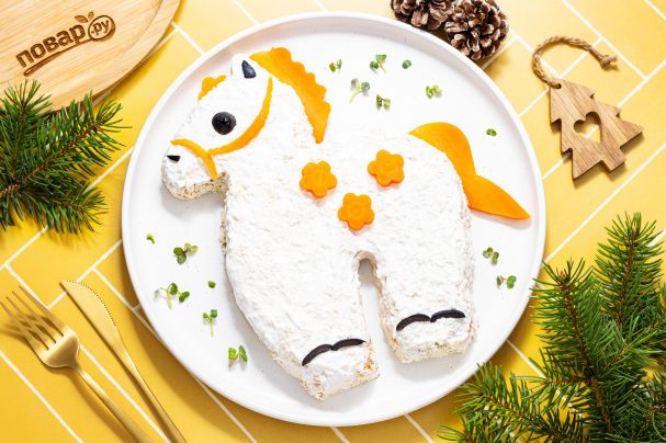 Хорошо смажьте последний слой постным майонезом. Подправьте все неровности, уберите крошки. Из кусочков вареной моркови сделайте гриву и хвост для лошади, а из маслины глаз. После можно добавить декора салату на свой вкус. Затем желательно убрать салат на пару часов в холодильник, чтобы он настоялся.