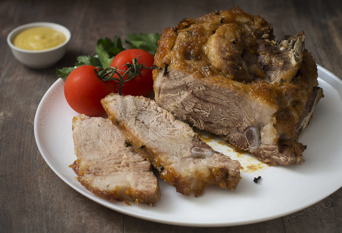 В этом несложном рецепте свиной окорок сначала отваривается до готовности, а затем недолго запекается в духовке под ароматной корочкой из апельсинового джема и пикантной горчицы. В итоге получается аппетитное и нарядное блюдо, которое может стать настоящим украшением праздничного стола. Свиное мясо пропитывается ароматами специй и получается очень нежным и не слишком жирным, поэтому в умеренных количествах оно подойдет даже для диетического питания. Внутри большого куска окорока мясо получается довольно постным, а по краям оно покрыто аппетитной прослойкой жира. Снаружи окорока образуется великолепная румяная корочка, покрытая кисло-сладкой фруктовой глазурью с пикантным привкусом горчицы и ароматом коньяка.